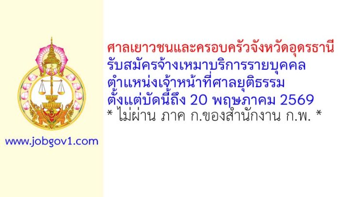 ศาลเยาวชนและครอบครัวจังหวัดอุดรธานี รับสมัครจ้างเหมาบริการรายบุคคล ตำแหน่งเจ้าหน้าที่ศาลยุติธรรม ตั้งแต่บัดนี้ถึง 20 พฤษภาคม 2569