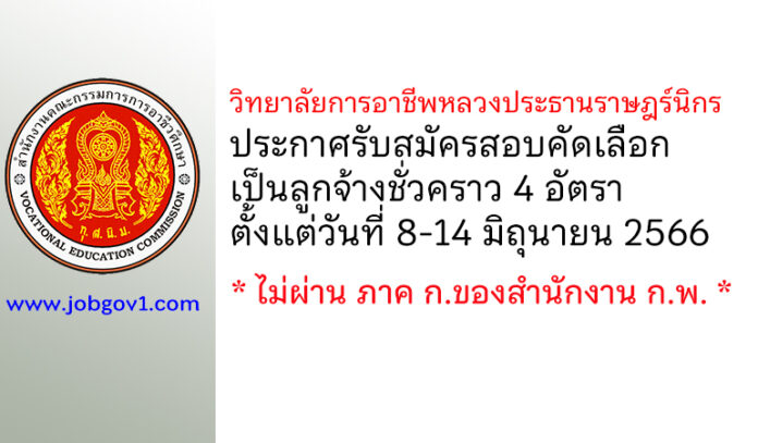 ประกาศวิทยาลัยการอาชีพหลวงประธานราษฎร์นิกร เรื่อง รับสมัครบุคคลทั่วไปสอบคัดเลือกเป็นลูกจ้างชั่วคราว จำนวน 4 อัตรา