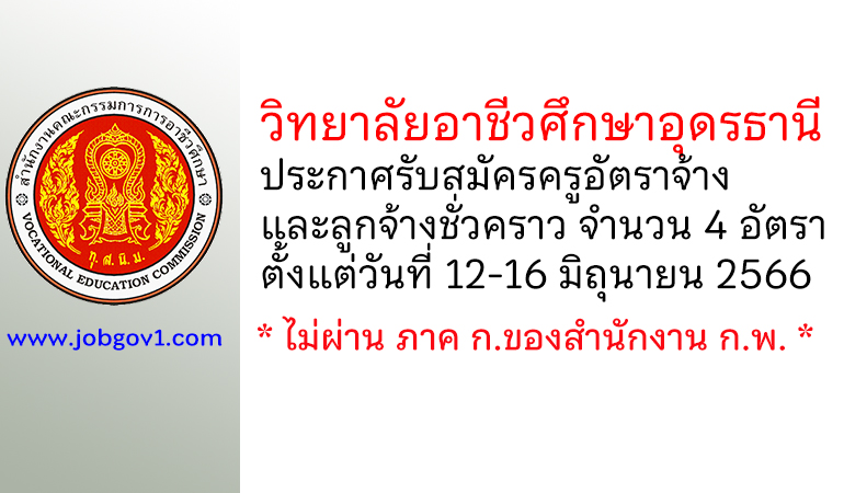 วิทยาลัยอาชีวศึกษาอุดรธานี รับสมัครครูอัตราจ้าง และลูกจ้างชั่วคราว 4 อัตรา ตั้งแต่วันที่ 12-16 มิถุนายน 2566