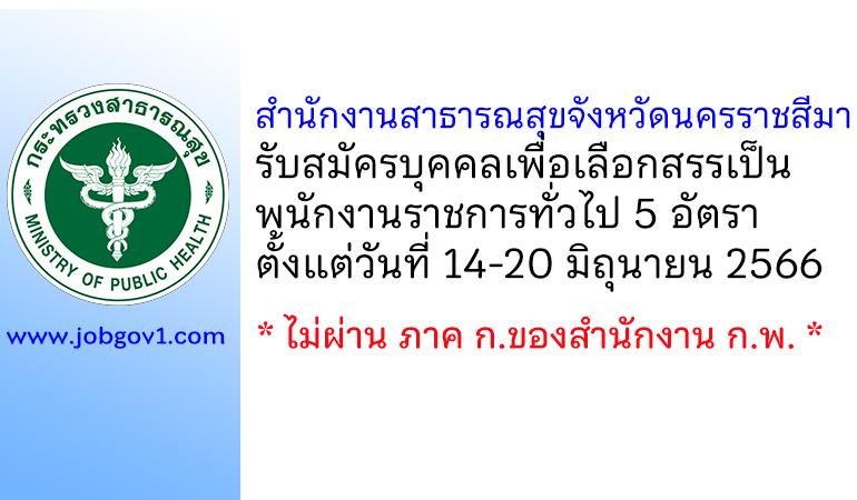 สำนักงานสาธารณสุขจังหวัดนครราชสีมา รับสมัครบุคคลเพื่อเลือกสรรเป็นพนักงานราชการทั่วไป 5 อัตรา ตั้งแต่วันที่ 14-20 มิถุนายน 2566