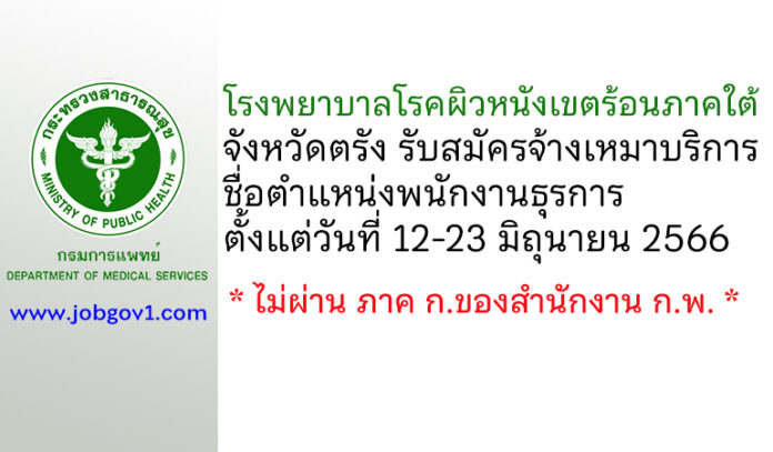 โรงพยาบาลโรคผิวหนังเขตร้อนภาคใต้ จังหวัดตรัง รับสมัครจ้างเหมาบริการ ตำแหน่งพนักงานธุรการ ตั้งแต่วันที่ 12-23 มิถุนายน 2566