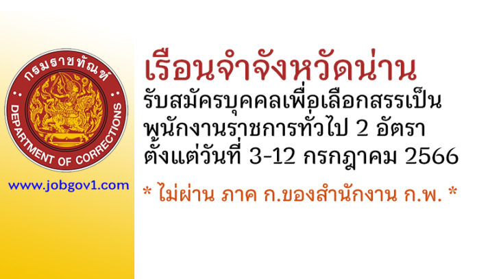 เรือนจำจังหวัดน่าน รับสมัครบุคคลเพื่อเลือกสรรเป็นพนักงานราชการทั่วไป 2 อัตรา ตั้งแต่วันที่ 3-12 กรกฎาคม 2566