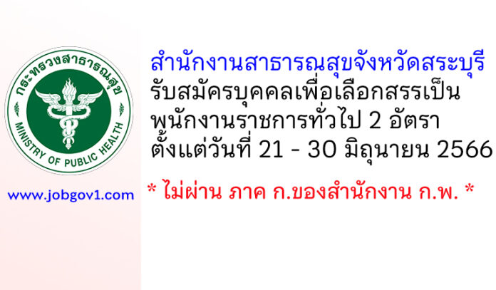 สำนักงานสาธารณสุขจังหวัดสระบุรี รับสมัครบุคคลเพื่อเลือกสรรเป็นพนักงานราชการทั่วไป 2 อัตรา ตั้งแต่วันที่ 21 – 30 มิถุนายน 2566