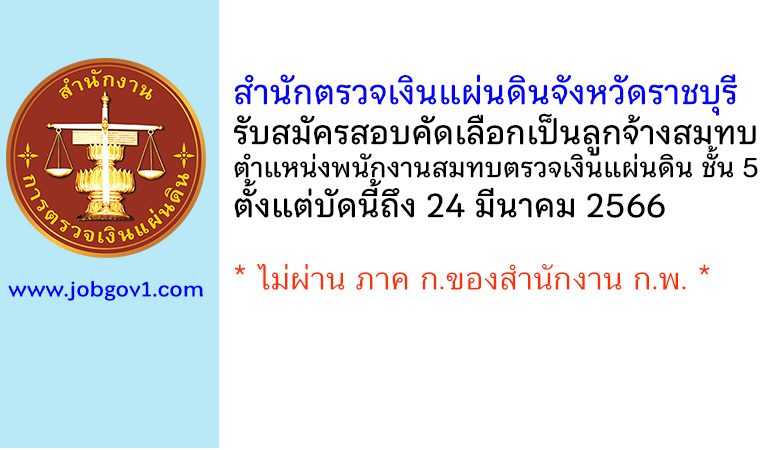 สำนักตรวจเงินแผ่นดินจังหวัดราชบุรี รับสมัครสอบคัดเลือกเป็นลูกจ้างสมทบ ตำแหน่งพนักงานสมทบตรวจเงินแผ่นดิน ชั้น 5