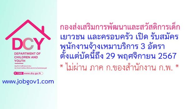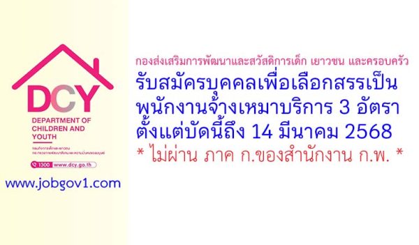 กองส่งเสริมการพัฒนาและสวัสดิการเด็ก เยาวชน และครอบครัว รับสมัครพนักงานจ้างเหมาบริการ 3 อัตรา ตั้งแต่บัดนี้ถึง 29 พฤศจิกายน 2567