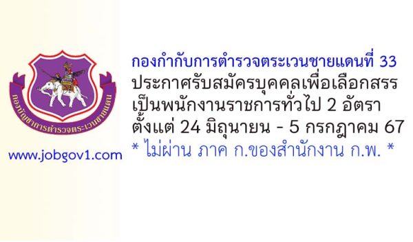 กองกำกับการตำรวจตระเวนชายแดนที่ 33 รับสมัครบุคคลเพื่อเลือกสรรเป็นพนักงานราชการทั่วไป 2 อัตรา ตั้งแต่ 24 มิถุนายน – 5 กรกฎาคม 2567