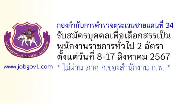 กองกำกับการตำรวจตระเวนชายแดนที่ 34 รับสมัครบุคคลเพื่อเลือกสรรเป็นพนักงานราชการทั่วไป 2 อัตรา ตั้งแต่วันที่ 8-17 สิงหาคม 2567