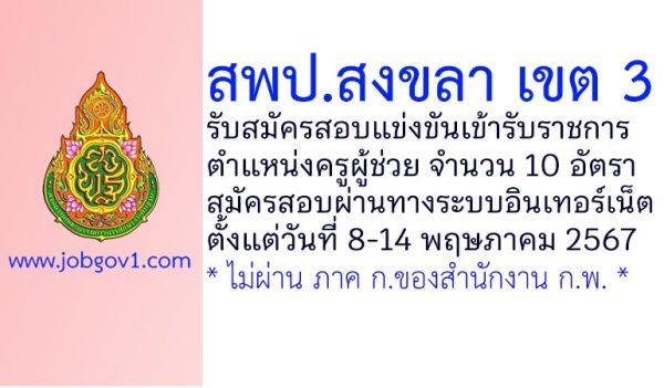 สพป.สงขลา เขต 3 รับสมัครสอบแข่งขันเข้ารับราชการ ตำแหน่งครูผู้ช่วย 10 อัตรา ตั้งแต่วันที่ 8-14 พฤษภาคม 2567