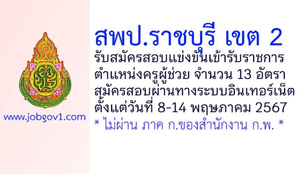 สพป.ราชบุรี เขต 2 รับสมัครสอบแข่งขันเข้ารับราชการ ตำแหน่งครูผู้ช่วย 13 อัตรา ตั้งแต่วันที่ 8-14 พฤษภาคม 2567