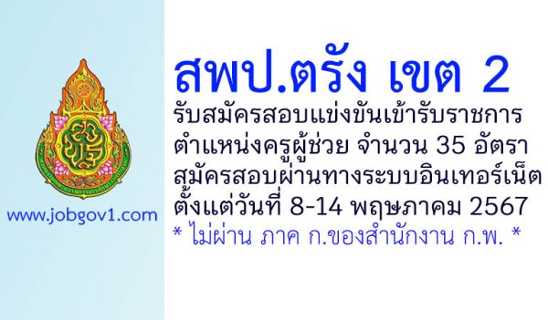 สพป.ตรัง เขต 2 รับสมัครสอบแข่งขันเข้ารับราชการ ตำแหน่งครูผู้ช่วย 35 อัตรา ตั้งแต่วันที่ 8-14 พฤษภาคม 2567