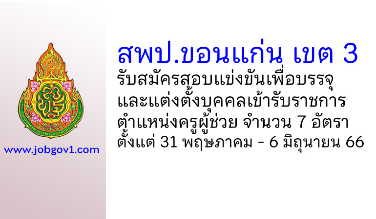 สพป.ขอนแก่น เขต 3 รับสมัครสอบแข่งขันเพื่อบรรจุบุคคลเข้ารับราชการ ตําแหน่งครูผู้ช่วย 7 อัตรา