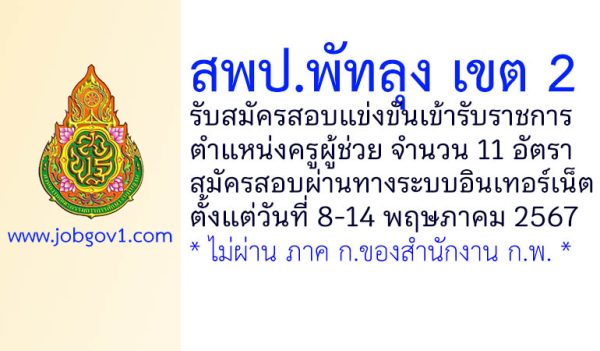 สพป.พัทลุง เขต 2 รับสมัครสอบแข่งขันเข้ารับราชการ ตำแหน่งครูผู้ช่วย 11 อัตรา ตั้งแต่วันที่ 8-14 พฤษภาคม 2567