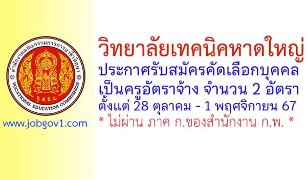 วิทยาลัยเทคนิคหาดใหญ่ รับสมัครครูอัตราจ้าง จำนวน 2 อัตรา ตั้งแต่ 28 ตุลาคม – 1 พฤศจิกายน 2567