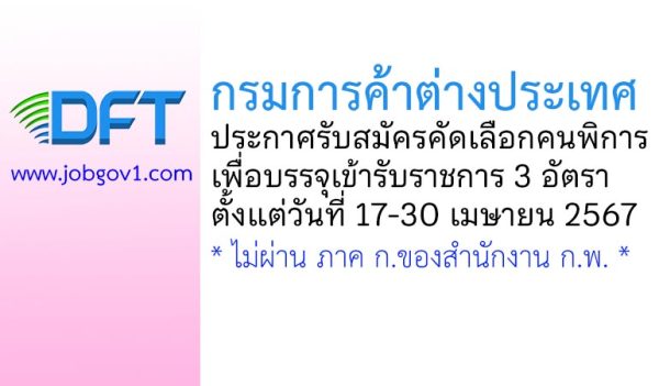 กรมการค้าต่างประเทศ รับสมัครคัดเลือกคนพิการเพื่อบรรจุเข้ารับราชการ 3 อัตรา ตั้งแต่วันที่ 17-30 เมษายน 2567