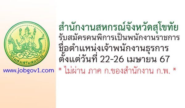 สำนักงานสหกรณ์จังหวัดสุโขทัย รับสมัครคนพิการเป็นพนักงานราชการ ตำแหน่งเจ้าพนักงานธุรการ ตั้งแต่วันที่ 22-26 เมษายน 2567