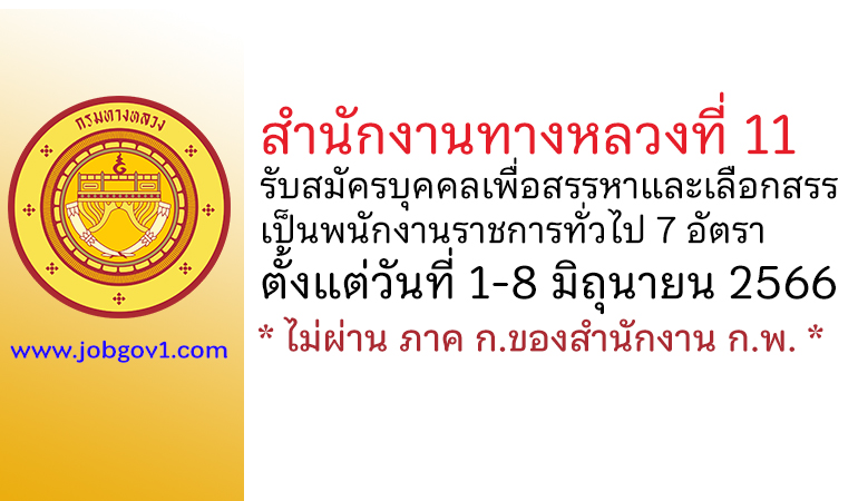 สำนักงานทางหลวงที่ 11 รับสมัครบุคคลเพื่อสรรหาและเลือกสรรเป็นพนักงานราชการทั่วไป 7 อัตรา ตั้งแต่วันที่ 1-8 มิถุนายน 2566