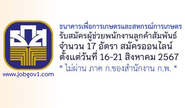 ธนาคารเพื่อการเกษตรและสหกรณ์การเกษตร รับสมัครผู้ช่วยพนักงานลูกค้าสัมพันธ์ 17 อัตรา ตั้งแต่วันที่ 16-21 สิงหาคม 2567