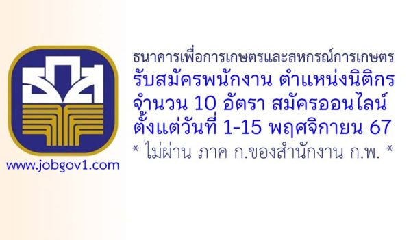 ธนาคารเพื่อการเกษตรและสหกรณ์การเกษตร รับสมัครพนักงาน ตำแหน่งนิติกร จำนวน 10 อัตรา ตั้งแต่วันที่ 1-15 พฤศจิกายน 2567