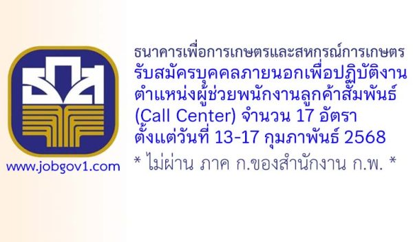 ธนาคารเพื่อการเกษตรและสหกรณ์การเกษตร รับสมัครบุคคลภายนอกเพื่อปฏิบัติงาน ตำแหน่งผู้ช่วยพนักงานลูกค้าสัมพันธ์ (Call Center) 17 อัตรา ตั้งแต่วันที่ 13-17 กุมภาพันธ์ 2568