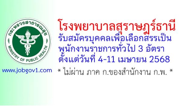 โรงพยาบาลสุราษฎร์ธานี รับสมัครบุคคลเพื่อเลือกสรรเป็นพนักงานราชการทั่วไป 3 อัตรา ตั้งแต่วันที่ 4-11 เมษายน 2568