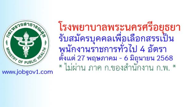 โรงพยาบาลพระนครศรีอยุธยา รับสมัครบุคคลเพื่อเลือกสรรเป็นพนักงานราชการทั่วไป 4 อัตรา ตั้งแต่ 27 พฤษภาคม – 6 มิถุนายน 2568