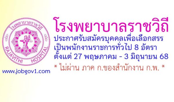 โรงพยาบาลราชวิถี รับสมัครบุคคลเพื่อเลือกสรรเป็นพนักงานราชการทั่วไป 8 อัตรา ตั้งแต่ 27 พฤษภาคม – 3 มิถุนายน 2568