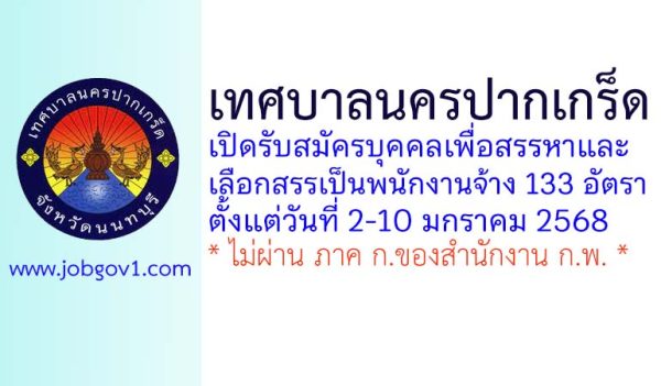 เทศบาลนครปากเกร็ด รับสมัครบุคคลเพื่อสรรหาและเลือกสรรเป็นพนักงานจ้าง 133 อัตรา ตั้งแต่วันที่ 2-10 มกราคม 2568