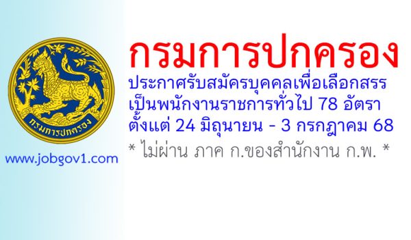กรมการปกครอง รับสมัครบุคคลเพื่อเลือกสรรเป็นพนักงานราชการทั่วไป 78 อัตรา ตั้งแต่ 24 มิถุนายน – 3 กรกฎาคม 2568