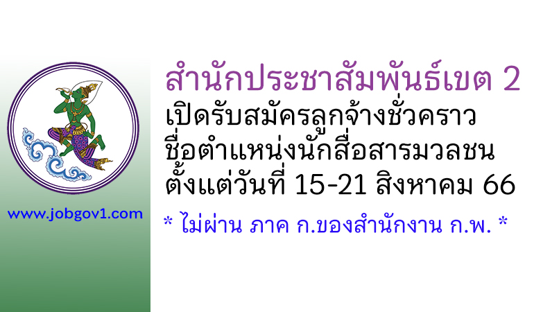 สำนักประชาสัมพันธ์เขต 2 รับสมัครลูกจ้างชั่วคราว ตำแหน่งนักสื่อสารมวลชน ตั้งแต่วันที่ 15-21 สิงหาคม 2566