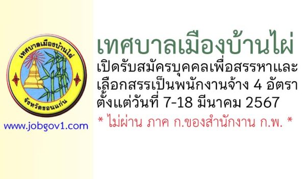 เทศบาลเมืองบ้านไผ่ รับสมัครบุคคลเพื่อสรรหาและเลือกสรรเป็นพนักงานจ้าง 4 อัตรา ตั้งแต่วันที่ 7-18 มีนาคม 2567