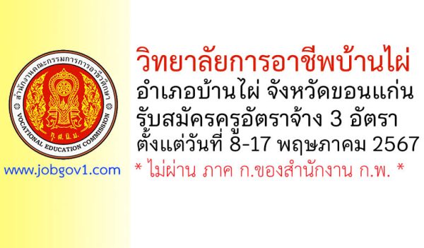 วิทยาลัยการอาชีพบ้านไผ่ รับสมัครครูอัตราจ้าง 3 อัตรา ตั้งแต่วันที่ 8-17 พฤษภาคม 2567