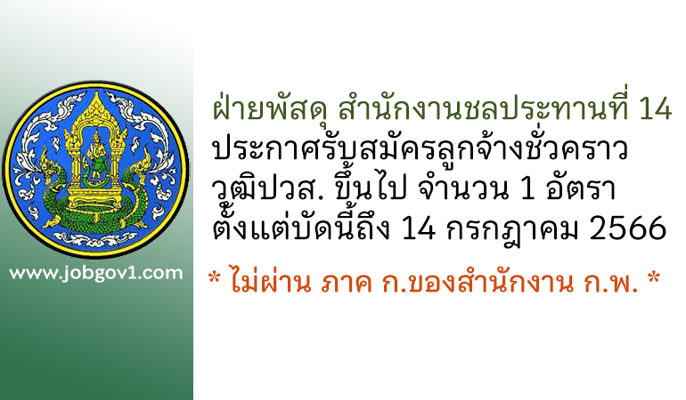 ฝ่ายพัสดุ สำนักงานชลประทานที่ 14 รับสมัครลูกจ้างชั่วคราว จำนวน 1 อัตรา ตั้งแต่บัดนี้ถึง 14 กรกฎาคม 2566