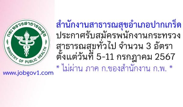 สำนักงานสาธารณสุขอำเภอปากเกร็ด รับสมัครพนักงานกระทรวงสาธารณสุขทั่วไป 2 อัตรา ตั้งแต่วันที่ 5-9 สิงหาคม 2567