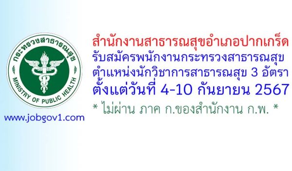 สำนักงานสาธารณสุขอำเภอปากเกร็ด รับสมัครพนักงานกระทรวงสาธารณสุขทั่วไป ตำแหน่งนักวิชาการสาธารณสุข 3 อัตรา ตั้งแต่วันที่ 4-10 กันยายน 2567