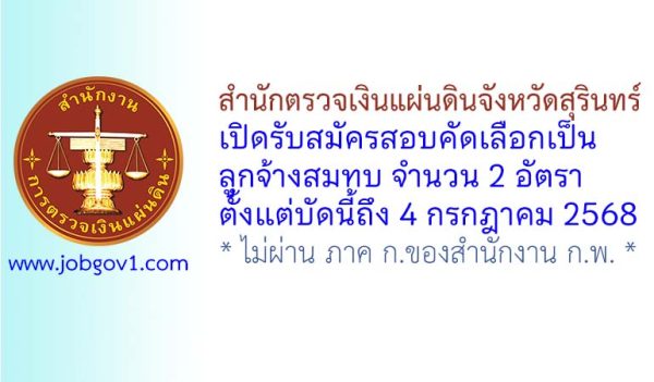 สำนักตรวจเงินแผ่นดินจังหวัดสุรินทร์ รับสมัครสอบคัดเลือกเป็นลูกจ้างสมทบ 2 อัตรา ตั้งแต่บัดนี้ถึง 4 กรกฎาคม 2568