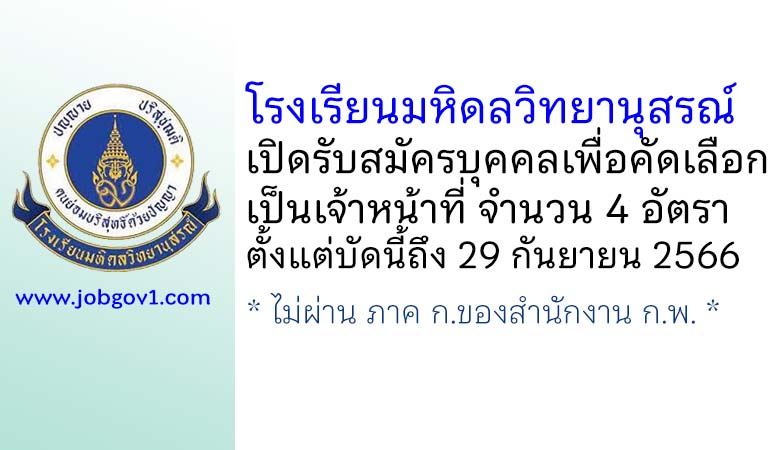 โรงเรียนมหิดลวิทยานุสรณ์ รับสมัครบุคคลเพื่อคัดเลือกเป็นเจ้าหน้าที่ 5 อัตรา ตั้งแต่บัดนี้ถึง 23 กุมภาพันธ์ 2567