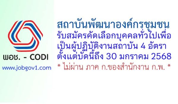 สถาบันพัฒนาองค์กรชุมชน (องค์การมหาชน) รับสมัครคัดเลือกบุคคลทั่วไปเพื่อเป็นผู้ปฏิบัติงานสถาบัน 4 อัตรา ตั้งแต่บัดนี้ถึง 30 มกราคม 2568