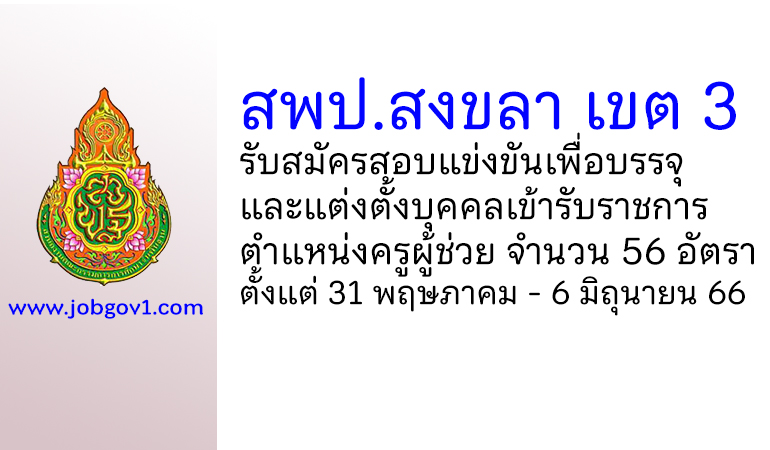 สพป.สงขลา เขต 3 รับสมัครสอบแข่งขัน ตําแหน่งครูผู้ช่วย จำนวน 56 อัตรา ตั้งแต่ 31 พฤษภาคม – 6 มิถุนายน 2566