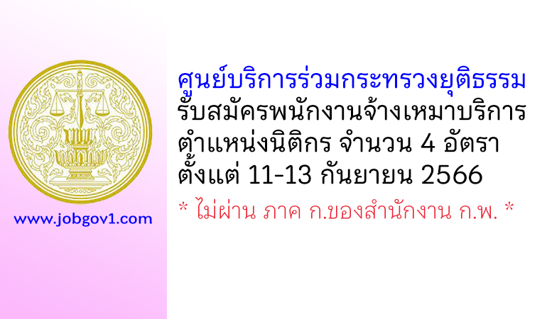 ศูนย์บริการร่วมกระทรวงยุติธรรม รับสมัครพนักงานจ้างเหมาบริการ ตำแหน่งนิติกร 4 อัตรา ตั้งแต่วันที่ 11-13 กันยายน 2566