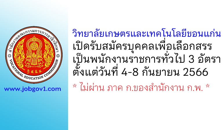วิทยาลัยเกษตรและเทคโนโลยีขอนแก่น รับสมัครบุคคลเพื่อเลือกสรรเป็นพนักงานราชการทั่วไป 3 อัตรา ตั้งแต่วันที่ 4-8 กันยายน 2566