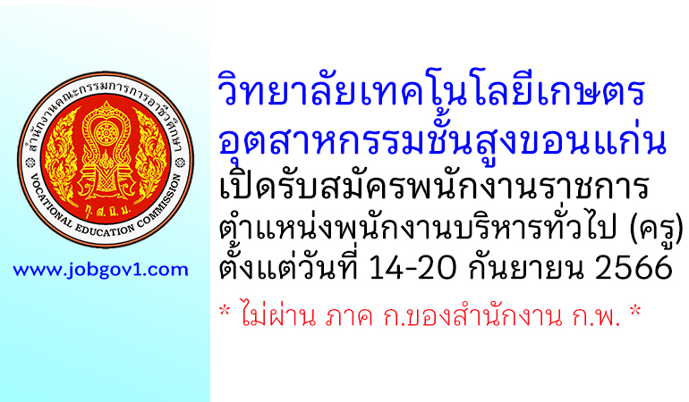 วิทยาลัยเทคโนโลยีเกษตรอุตสาหกรรมชั้นสูงขอนแก่น รับสมัครพนักงานราชการ ตำแหน่งพนักงานบริหารทั่วไป (ครู) ตั้งแต่วันที่ 14-20 กันยายน 2566