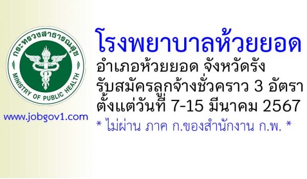 โรงพยาบาลห้วยยอด รับสมัครลูกจ้างชั่วคราว 3 อัตรา ตั้งแต่วันที่ 7-15 มีนาคม 2567