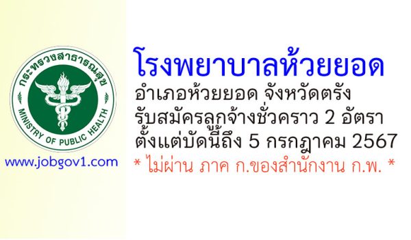 โรงพยาบาลห้วยยอด รับสมัครลูกจ้างชั่วคราว 2 อัตรา ตั้งแต่บัดนี้ถึง 5 กรกฎาคม 2567