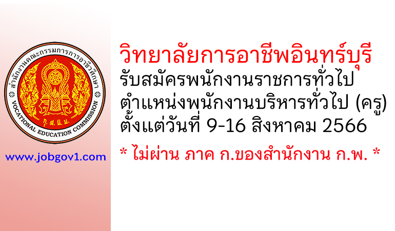 วิทยาลัยการอาชีพอินทร์บุรี รับสมัครพนักงานราชการทั่วไป ตำแหน่งพนักงานบริหารทั่วไป (ครู) ตั้งแต่วันที่ 9-16 สิงหาคม 2566