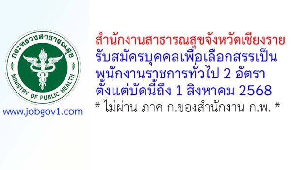 สำนักงานสาธารณสุขจังหวัดเชียงราย รับสมัครบุคคลเพื่อเลือกสรรเป็นพนักงานราชการทั่วไป 2 อัตรา ตั้งแต่บัดนี้ถึง 1 สิงหาคม 2568