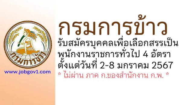 กรมการข้าว รับสมัครบุคคลเพื่อเลือกสรรเป็นพนักงานราชการทั่วไป 4 อัตรา ตั้งแต่วันที่ 2-8 มกราคม 2567