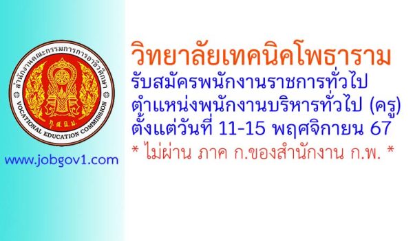 วิทยาลัยเทคนิคโพธาราม รับสมัครพนักงานราชการทั่วไป ตำแหน่งพนักงานบริหารทั่วไป (ครู) ตั้งแต่วันที่ 11-15 พฤศจิกายน 2567